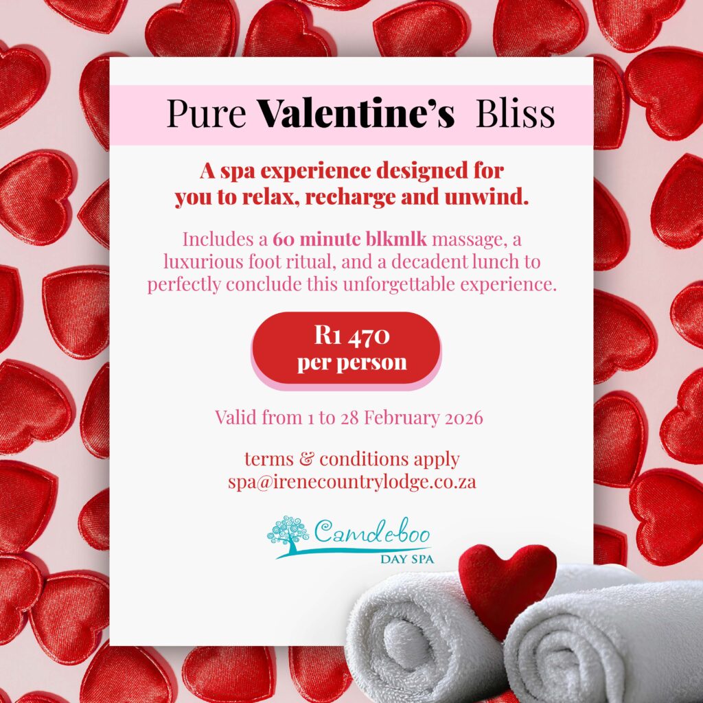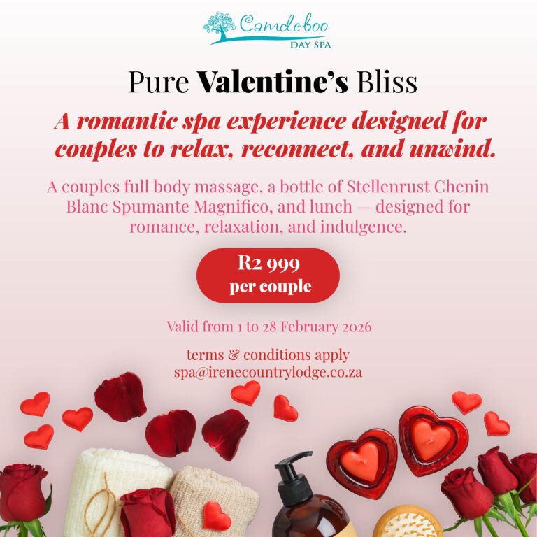 Please note that terms and conditions apply. Valid from 1 February – 28 February 2026. These promotional offers cannot be used in conjunction with any other promotion or package and are subject to availability. Please ensure you book in advance and pre-payment is required to secure your booking. All promotions include complimentary parking. All guests over the age of 16 years old are welcome at Camdeboo Day Spa. Subject to availability. Please provide 24 hours’ notice before canceling or rescheduling appointments or you may be charged 50% of your treatment cost. Other restrictions apply.